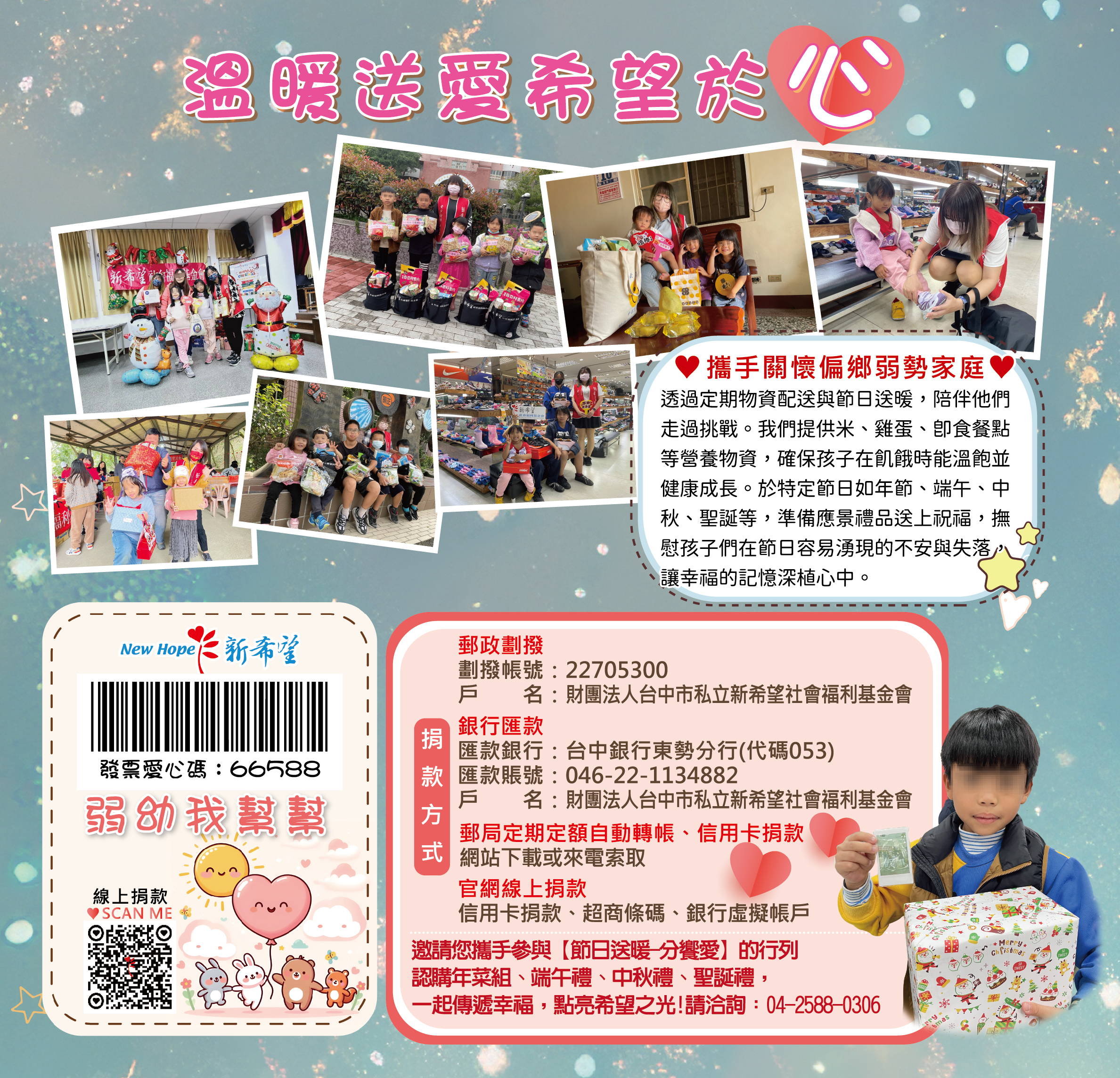 讓我們一起,讓愛不間斷、讓希望長存,讓每個孩子都能在團圓的節日裡感受到幸福與微笑。
